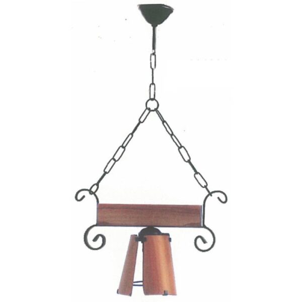 Colgante con 1 luz (E-27). Modelo listón de madera y caracoles de pletina, carcaza de 3 tejas de 15. Pintado en negro (c-1).